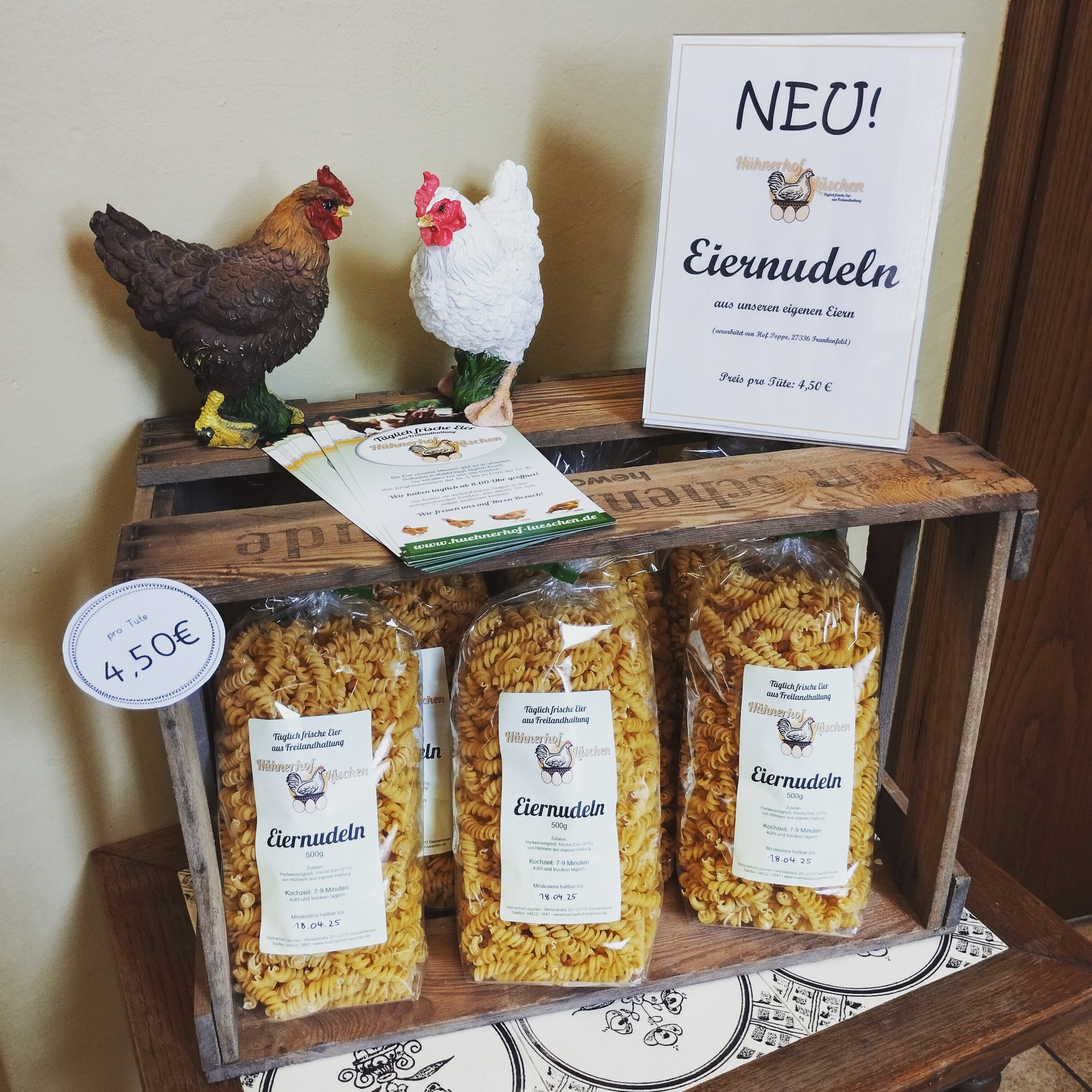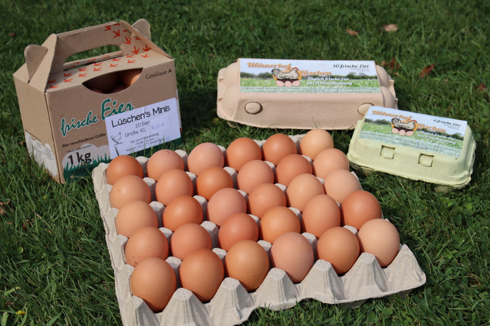 Unsere insgesamt ca. 1000 Hühner leben in 3 Ställen in Freilandhaltung und werden täglich bis spätestens 9:30 Uhr nach draußen gelassen. Dort können sie sich auf über 2000 qm (pro Stall) Freifläche und Weide aufhalten und Gras, Kräuter oder Würmer und andere Kleintiere fressen. Unter Bäumen haben sie Schutz vor direkter Sonne und Raubvögeln. Zum Legen oder abends bei Einbruch der Dunkelheit gehen sie dann selbstständig wieder in ihren Stall zurück.